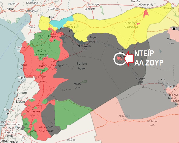 Στον πολεμικό χάρτη που ακολουθεί, μέσα στον άσπρο κύκλο εκεί που δείχνει το βελάκι, η πόλη Ντέιρ Αλ Ζουρ.