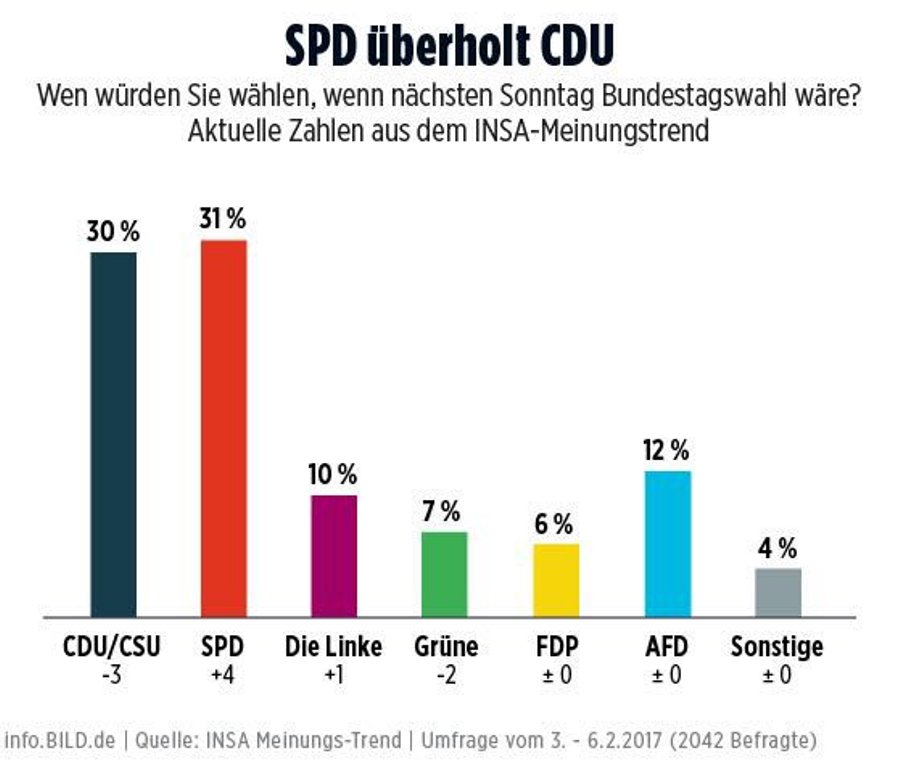Σύμφωνα με δημοσκόπηση του Ινστιτούτου Insa για την εφημερίδα Bild, το SPD έπιασε ποσοστό ύψους 31%, κερδίζοντας τέσσερις ποσοστιαίες μονάδες σε σχέση με την περασμένη εβδομάδα.