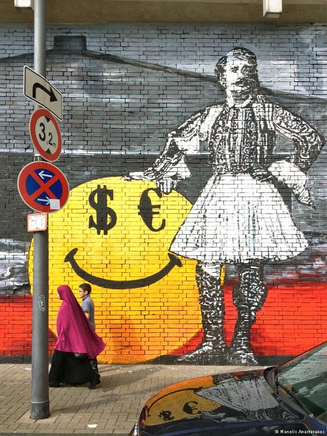 Ο τσολιάς ακουμπάει σε ένα τεράστιο κίτρινο smiley που στο ένα μάτι έχει το δολάριο και στο άλλο το ευρώ.
