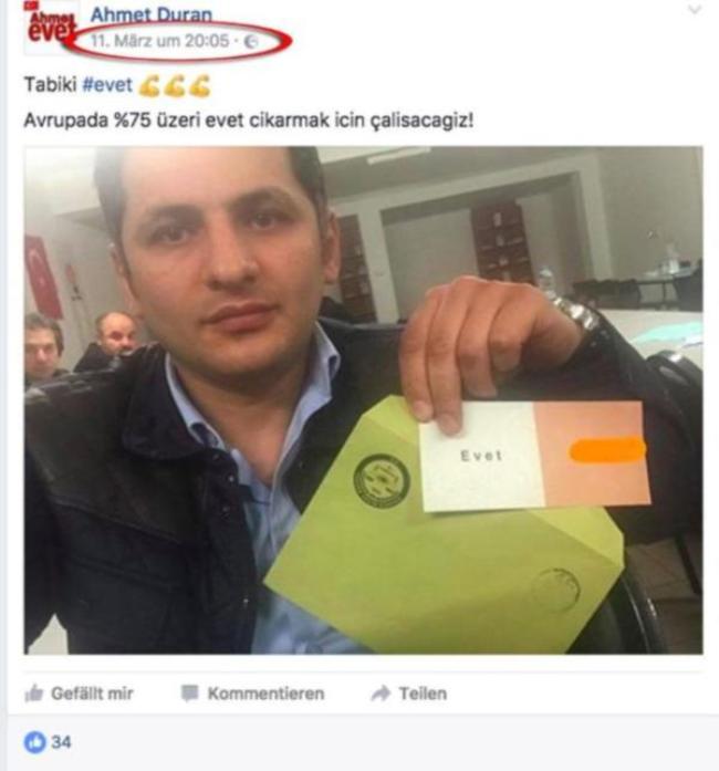 Ο οπαδός του Ερντογάν, Ντουράν, ανάρτησε τη φωτογραφία στον προσωπικό του λογαριασμό στο Facebook στις 11η Μαρτίου, δηλαδή πριν ακόμα αποσταλούν επισήμως τα ψηφοδέλτια στις κατά τόπους τουρκικές προξενικές Αρχές.