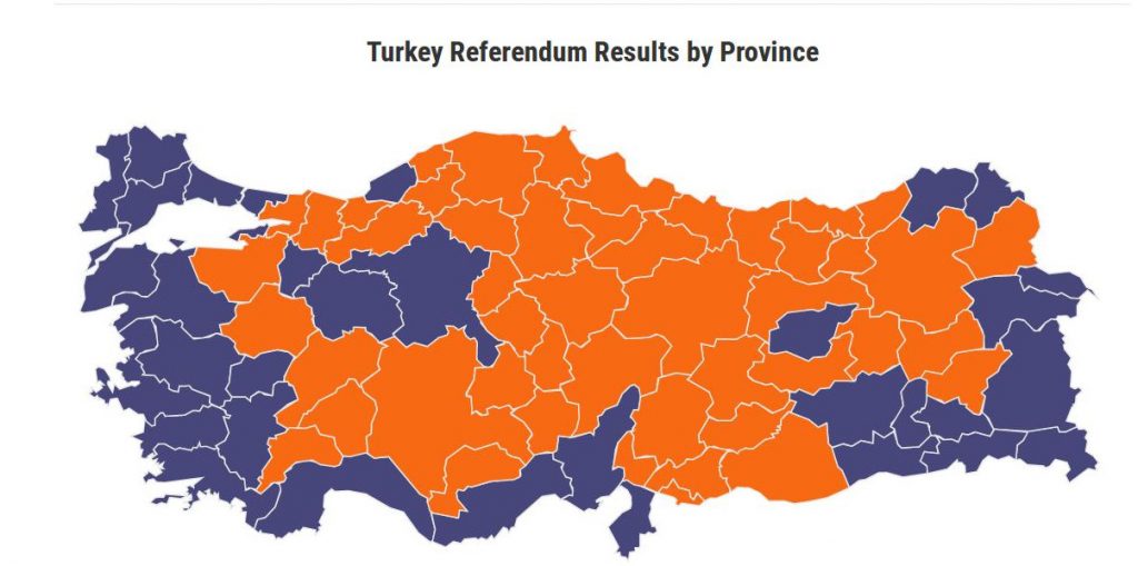 Στον χάρτη ανά περιφέρεια, παρατηρεί κανείς ότι σχεδόν όλα ανεξαιρέτως τα παράλια, από την Αττάλεια, ως την Μικρά Ασία και τον Βόσπορο ψήφισαν υπέρ του «όχι» όπως και στα βάθη της ανατολικής Τουρκίας.