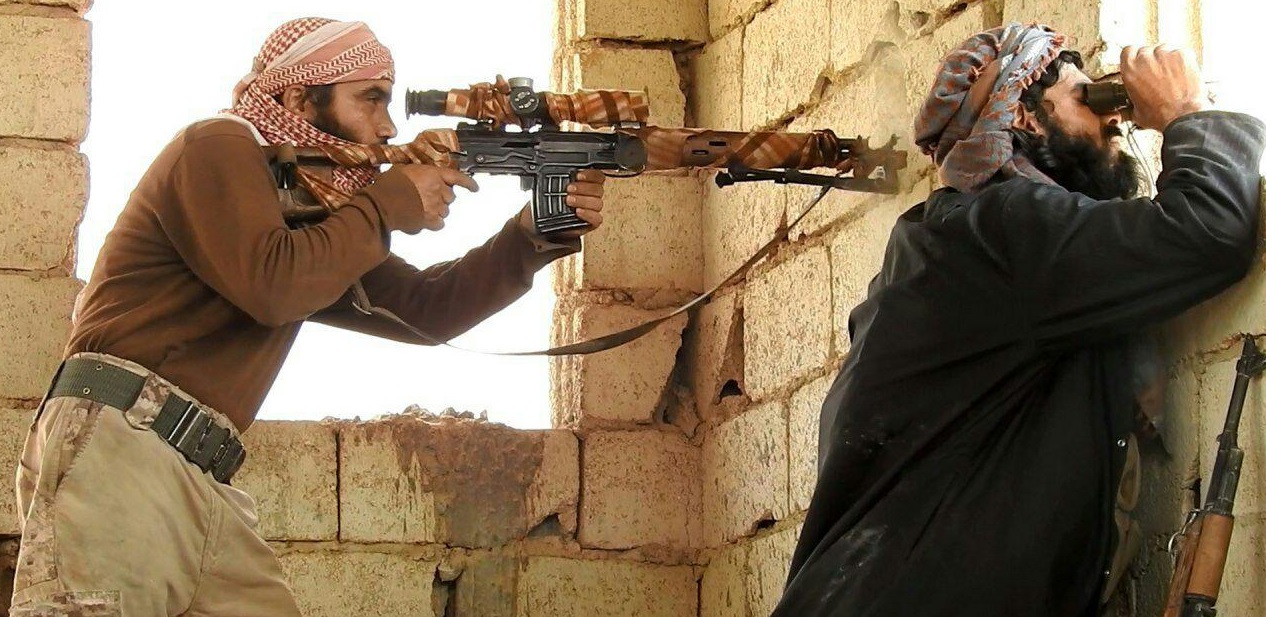 Ελεύθερος σκοπευτής της οργάνωσης Ισλαμικό Κράτος με τον βοηθό του στην πολιορκημένη Τάμπκα. Το Ισλαμικό Κράτος αναρτά φωτογραφίες για να τονώσει το ηθικό των τζιχαντιστών του.
