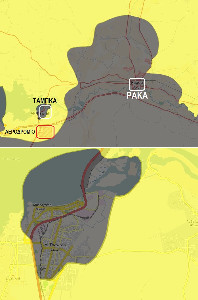 Πάνω ο χάρτης της ευρύτερης περιοχής, με την Τάμπκα, το αεροδρόμιό της και ανατολικά τη Ράκα.