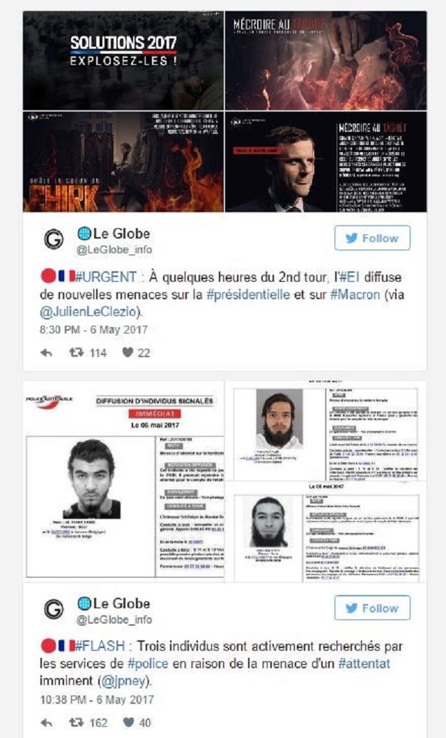 «Ανατινάξτε τους», «χτυπήστε τους ψηφοφόρους» είναι τα μηνύματα των τρομοκρατών που δημοσίευσαν και φωτογραφία του Εμμανουέλ Μακρόν που τον σημαδεύει διόπτρα όπλου.
