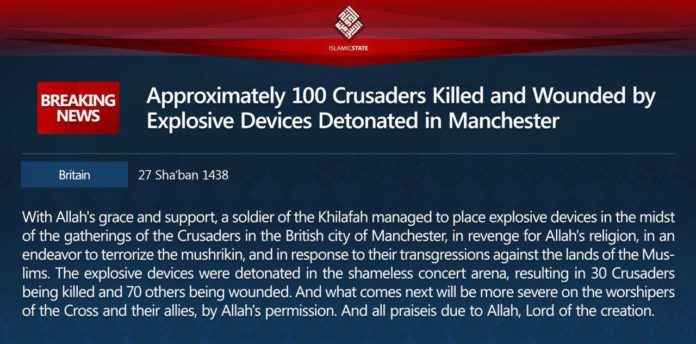 Το μεσημέρι της Τρίτης η τρομοκρατική οργάνωση Ισλαμικό Κράτος (ISIS) ανέλαβε πλήρως την ευθύνη για τη βομβιστική επίθεση αυτοκτονίας το βράδυ της Δευτέρας στο Μάντσεστερ της βορειοδυτικής Αγγλίας.