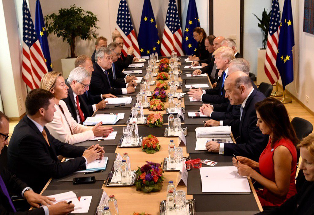 Πρόκειται για την πρώτη συνάντηση του προέδρου των ΗΠΑ με αξιωματούχους της Ευρωπαϊκής Ένωσης, την οποία, ως γνωστόν, έχει επικρίνει έντονα στο παρελθόν.