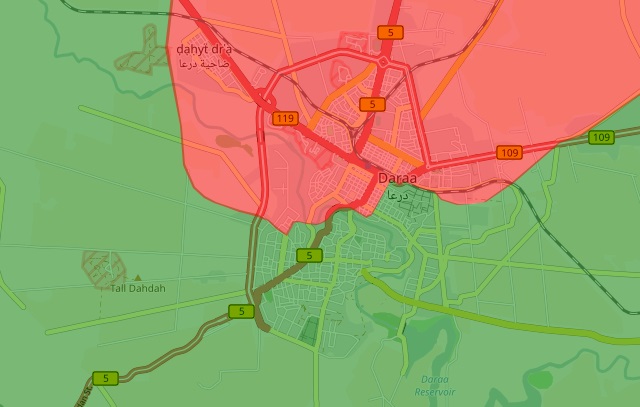 Δείτε πώς είναι μοιρασμένη η Νταράα σε πολεμικό χάρτη (Κόκκινο χρώμα η κυβέρνηση, πράσινο χρώμα οι τζιχαντιστές):