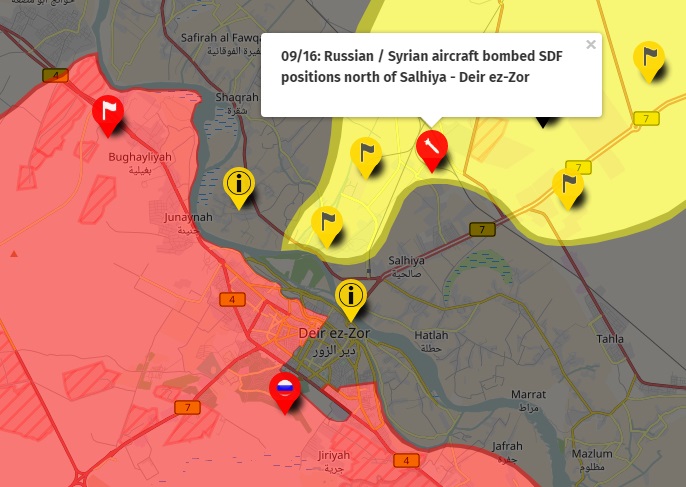 Πολεμικός χάρτης της πόλης Ντέιρ Αλ Ζουρ στην ανατολική Συρία. Με κόκκινο χρώμα είναι τα εδάφη και οι συνοικίες της πόλης που ελέγχει η κυβέρνηση, με μαύρο το Ισλαμικό Κράτος και με κίτρινο οι υπό κουρδική διοίκηση Συριακές Δημοκρατικές Δυνάμεις. Σημειωμένες με κόκκινο και σχετικά λεζάντα, οι κουρδικές θέσεις που βομβαρδίστηκαν.