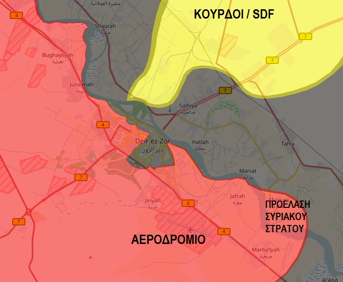 Οι τζιχαντιστές δύσκολα μπορούν να διαφύγουν από τις συνοικίες της Ντέιρ Αλ Ζουρ που κατέχουν πλέοντας στον Ευφράτη, επειδή η συριακή και η ρωσική αεροπορία βάζουν στο στόχαστρο όσους προσπαθούν να τον διασχίσουν, ανέφερε από την πλευρά του το Συριακό Παρατηρητήριο Ανθρωπίνων Δικαιωμάτων.