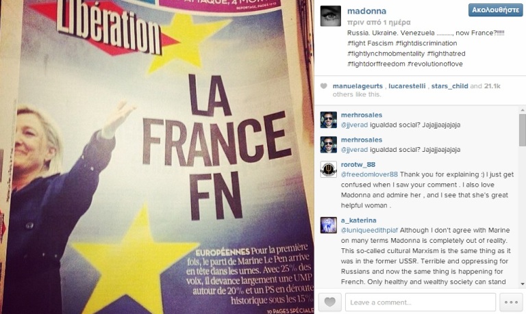 Η Μαντόνα εξέφρασε την ανησυχία της στον προσωπικό της λογαριασμό στο Instagram για τα ποσοστά που συγκέντρωσε το Εθνικό Μέτωπο (FN) της Γαλλίας στις ευρωεκλογές, προκαλώντας τη σαρκαστική αντίδραση του αντιπροέδρου του κόμματος αυτού της Ακροδεξιάς.