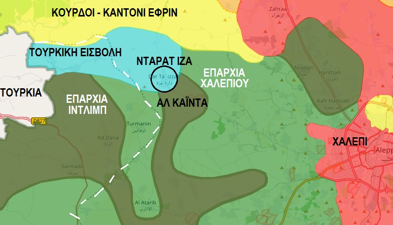 Το Anadolu μεταδίδει ότι οι κάτοικοι της κωμόπολης Νταράτ Ιζά, που βρίσκεται κοντά στα σύνορα με την Τουρκία στα δυτικά της επαρχίας του Χαλεπιού -βόρεια της Ιντλίμπ-, υποδέχτηκαν τους Τούρκους εισβολείς ζητωκραυγάζοντας υπέρ της Τουρκίας και του Ρετζέπ Ταγίπ Ερντογάν.