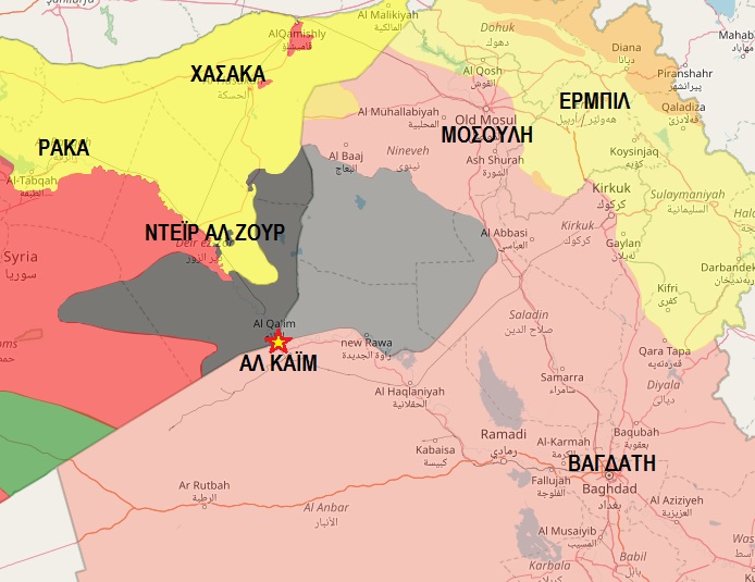 Στον πολεμικό χάρτη βλέπετε με μαύρο χρώμα τα εδάφη που ελέγχει το Ισλαμικό Κράτος στη Συρία και με γκρίζο στο Ιράκ – Η θέση της πόλης Αλ Καΐμ σημειωμένη με αστέρι: