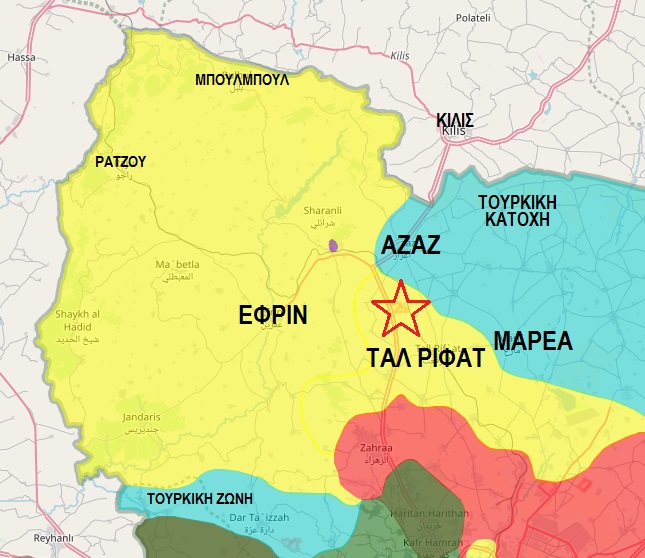 Πολεμικός χάρτης της περιοχής της Εφρίν: Με κίτρινο χρώμα τα εδάφη υπό κουρδικό έλεγχο. Με γαλάζιο χρώμα τα εδάφη υπό τουρκική κατοχή. Με κόκκινο χρώμα τα εδάφη υπό τον έλεγχο της συριακής κυβέρνησης. Με σκούρο πράσινο η Αλ Κάιντα και με ανοιχτό πράσινο οι «μετριοπαθείς» ισλαμιστές.