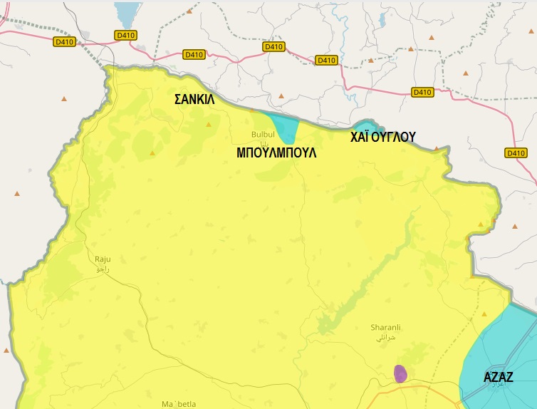 Στον πολεμικό χάρτη που ακολουθεί, βλέπετε με γαλάζιο χρώμα τα εδάφη που έχουν προωθηθεί οι Τούρκοι στην Εφρίν και δίνονται μάχες να εκδιωχθούν. Το Σανκίλ είναι πάλι στο κίτρινο, δηλαδή υπό κουρδικό έλεγχο.