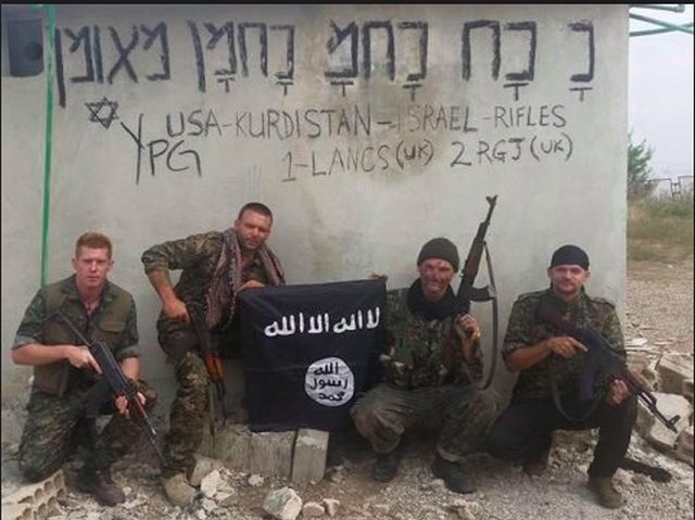 Ο Τζόε Ρόμπινσον με τους συμπολεμιστές του στη Συρία. Πίσω τους γραμμένο ένα σύνθημα που μιλά για κουρδικά, ισραηλινά και αμερικανικά τουφέκια που μάχονται μαζί. Στα μέτωπα της Συρίας σφυρηλατήθηκε μια ισχυρή συμμαχία Κούρδων και Ισραηλινών με έναν τρόπο που δεν έχει γίνει ευρύτερα γνωστός. Στη φωτογραφία από αριστερά απεικονίζονται ο Τζόε Ρόμπινσον, ο Τζόσουα Γουάσμπουρν, ο Τίμοθι Γουόρντσγορθ και ο Γιακόμπ Λέβι, κρατώντας μια σημαία της οργάνωσης Ισλαμικό Κράτος που πήραν λάφυρο.