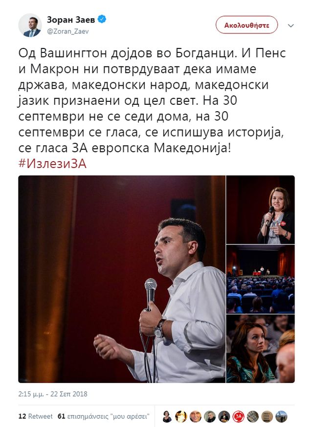 »Στις 30 Σεπτεμβρίου μη μείνετε στο σπίτι, στις 30 Σεπτεμβρίου ψηφίζουμε, γράφουμε ιστορία, ΨΗΦΙΖΟΥΜΕ ΓΙΑ ΤΗΝ ΕΥΡΩΠΑΪΚΗ ΜΑΚΕΔΟΝΙΑ!».