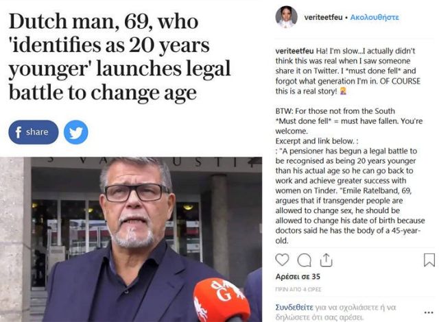 Ένας 69χρονος συνταξιούχος από την Ολλανδία παλεύει να αλλάξει νομικά την ηλικία του και να «μικρύνει» κατά 20 χρόνια για να μπορεί να δουλεύει περισσότερο αλλά και να προσελκύει περισσότερες γυναίκες στο… Tinder.