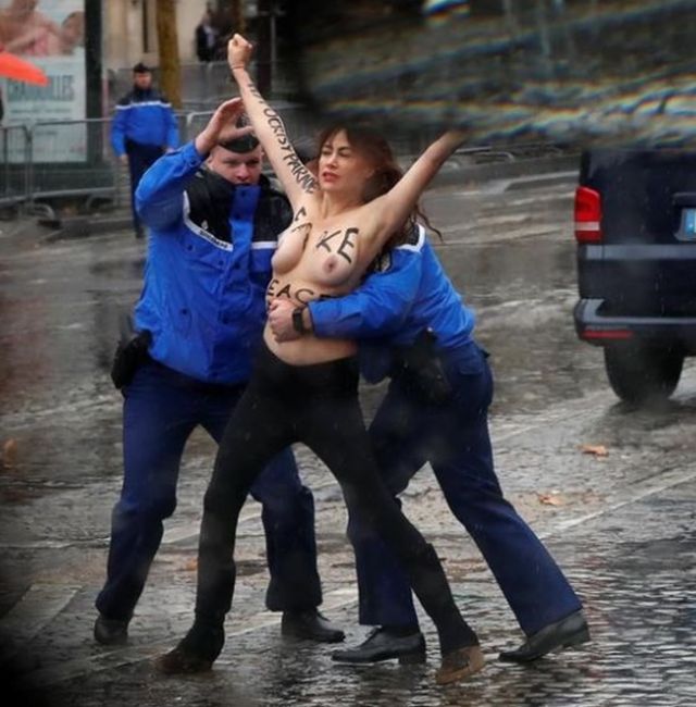 Ακτιβίστριες της οργάνωσης Femen —δύο σύμφωνα με το Γαλλικό Πρακτορείο ενώ το Ρόιτερ κάνει λόγο για μία διαδηλώτρια– παραβίασαν τα μέτρα ασφαλείας κατά τη διέλευση της επίσημης πομπής στο πλαίσιο των τελετών για την επέτειο της λήξης του Πρώτου Παγκόσμιου Πολέμου στο Παρίσι, και έτρεξαν προς το αυτοκίνητο του Αμερικανού προέδρου Ντόναλντ Τραμπ ενώ αυτό κατέβαινε τη λεωφόρο των Ηλυσίων Πεδίων (Σανζ Ελιζέ), πριν συλληφθούν από Γάλλους αστυνομικούς.