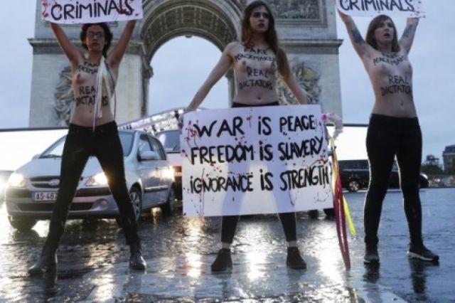 Το Σάββατο τρεις ακτιβίστριες της οργάνωσης Femen είχαν εμφανιστεί για λίγο γυμνόστηθες κάτω από την Αψίδα του Θριάμβου.