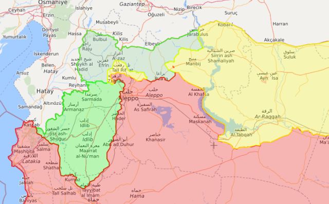 Στον χάρτη που ακολουθεί βλέπετε με πράσινο λαδί τα συριακά εδάφη που κατέχει σήμερα η Τουρκία και με έντονο πράσινο τα εδάφη που «προστατεύει».