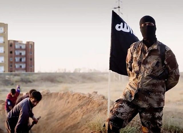 Μια από τις σκηνές που έκαναν «διάσημο» το Ισλαμικό Κράτος. Ο μασκοφόρος παρουσιαστής με την καναδέζικη προφορά μιλά ενώ πίσω του έξι άνδρες σκάβουν τους τάφους τους. Πιστεύεται ότι είναι ο Ριντουάν (κεντρική φωτογραφία)