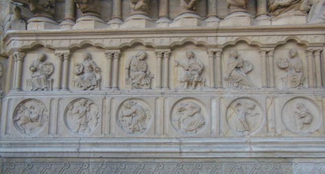 Αλλά και στις δύο πλευρές της μεγάλης εισόδου υπάρχουν στο υπέρθυρο δύο σειρές από 12 μετώπες και 12 μορφές που αντιπροσωπεύουν τα διαφορετικά στοιχεία και τις φάσεις της αλχημικής διαδικασίας.