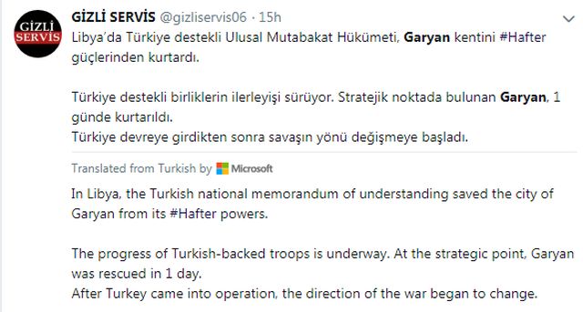 Σε αναρτήσεις στο Twitter δηλώνεται ευθεία εμπλοκή Τούρκων στις πολεμικές επιχειρήσεις στη Λιβύη και ότι χάρη στους Τούρκους πάρθηκε πίσω η Γαριάν: