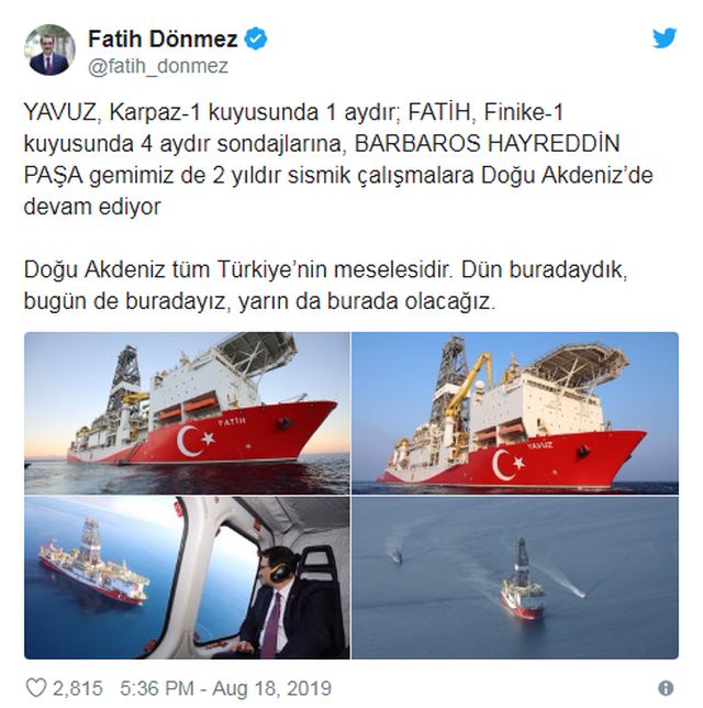 Εικόνες από τα τουρκικά γεωτρύπανα «Γιαβούζ» και «Φατίχ», καθώς και το σεισμογραφικό «Μπαρμπαρός» δημοσιεύει ο Τούρκος Υπουργός Ενέργειας, Φατίχ Ντονμέζ.