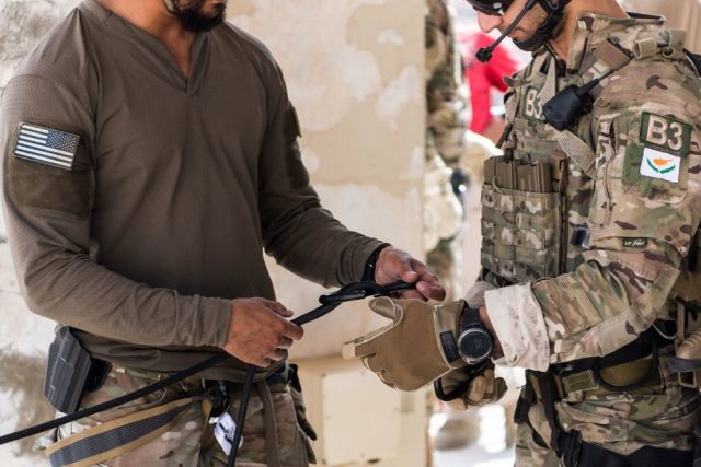 Οι άνδρες της κυπριακής Διοικήσεως Καταδρομών του ΓΕΕΦ, δύσκολα διακρινόμενοι λόγω της χρήσεως τυποποιημένων σύγχρονων ατομικών υλικών με κυρίαρχη της στολή μάχης σε παραλλαγή Multicam, ενισχύουν την ελληνική παρουσία στην πολυεθνική άσκηση, από την οποία για άλλη μια φορά απουσίαζε η Τουρκία.