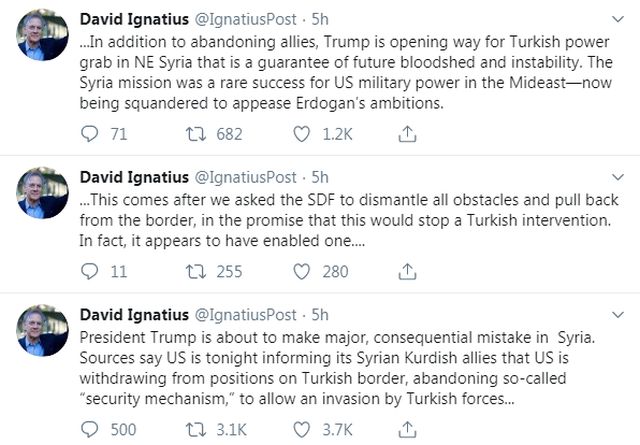Με τρεις διαδοχικές αναρτήσεις του στο Twitter ο αρθρογράφος της «Washington Post» Ντέιβιντ Ιγνατίους, ασκεί δριμεία κριτική στην απόφαση του Ντόναλντ Τραμπ, μετά από τηλεφωνική επικοινωνία που είχε με τον Ρετζέπ Ταγίπ Ερντογάν, να επιτρέψει τουρκική εισβολή στα κουρδικά εδάφη στη βόρεια και ανατολική Συρία.