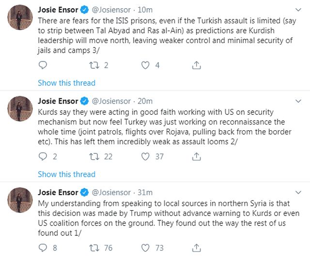 Η ανταποκρίτρια Μέσης Ανατολής της «Telegraph», Τζόσι Ένσορ (φωτο), γράφει στο Twitter ότι ο Ντόναλντ Τραμπ πήρε την απόφαση να δώσει το πράσινο φως στον Ρετζέπ Ταγίπ Ερντογάν να εισβάλει στα κουρδικά εδάφη στη Συρία μόνος του, δίχως να συμβουλευτεί κανέναν στον Λευκό Οίκο, στο Πεντάγωνο ή από τους συμμάχους του Διεθνούς Συνασπισμού που επίσης έχουν αναπτύξει στρατεύματα στην περιοχή, όπως Γάλλους, Βρετανούς κ.α.