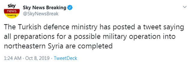 Το Sky News μετέδωσε, ξημερώματα Τρίτης, ότι το τουρκικό υπουργείο Άμυνας δημοσίευσε ανάρτηση στο Twitter στην οποία αναφέρει πως όλες οι προετοιμασίες για μια πιθανή στρατιωτική επιχείριση στη βορειοανατολική Συρία έχουν ολοκληρωθεί.