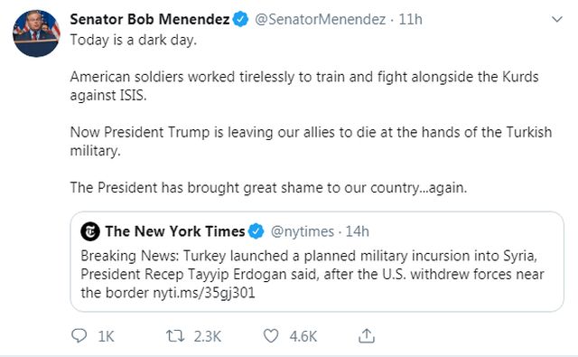 «Σήμερα είναι μια μαύρη μέρα», δήλωσε την Τετάρτη ο γερουσιαστής Ρόμπερτ Μενέντεζ (Δημοκρατικός από το Νιου Τζέρσεϊ) σχολιάζοντας την τουρκική εισβολή «επιχείριση Άνοιξη της Ειρήνης» στη βόρεια και ανατολική Συρία εναντίον των συμμάχων της Αμερικής, των υπό κουρδική διοίκηση Συριακών Δημοκρατικών Δυνάμεων (SDF).