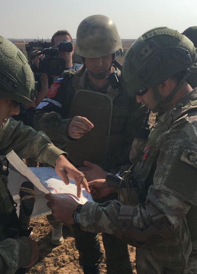 Ρώσοι στρατονόμοι συνεννοούνται με τους Τούρκους στρατιώτες για τη διαδρομή της περιπολίας.