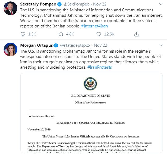 «Οι ηγέτες του Ιράν γνωρίζουν ότι ένα ελεύθερο και ανοικτό Ίντερνετ εκθέτει τη νομιμότητά τους, οπότε προσπαθούν να λογοκρίνουν την πρόσβαση στο Διαδίκτυο για να καταστείλουν τις αντικυβερνητικές διαδηλώσεις», επεσήμανε ο υπουργός Οικονομικών Στίβεν Μνούχιν σε ανακοίνωσή του.