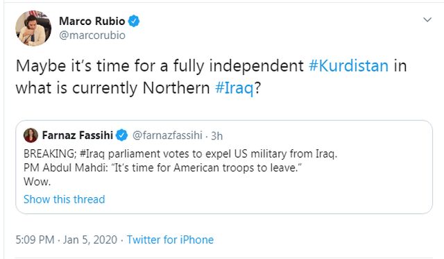 Ο Αμερικανός γερουσιαστής Μάρκο Ρούμπιο, ισχυρός φίλος της Ελλάδας και του Ισραήλ, σχολίασε ως εξής στο Twitter την πρόθεση του Ιράκ να διώξει τα αμερικανικά στρατεύματα από το έδαφός του: