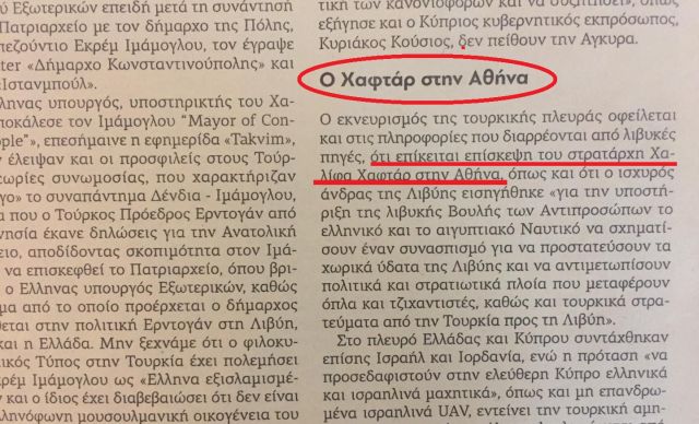 Την επίσκεψη του Χαλίφα Χαφτάρ στην Αθήνα είχε προαναγγείλει από τις 29 Δεκεμβρίου 2019 ο διπλωματικός συντάκτης Στέφανος Μυτιληναίος στην κυριακάτικη εφημερίδα «Νέα Σελίδα», όπως βλέπετε και στο απόκομμα: