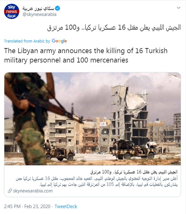 Ο Λιβυκός Εθνικός Στρατός (LNA) υποστηρίζει ότι σκότωσε τις τελευταίες ημέρες 16 Τούρκους στρατιώτες και περισσότερους από 100 Σύρους τζιχαντιστές μισθοφόρους, που εστάλησαν στη Λιβύη για να υποστηρίξουν την ισλαμική κυβέρνηση της Τρίπολης, μετέδωσε ο τηλεοπτικός σταθμός «Sky News Arabia TV» την Κυριακή.