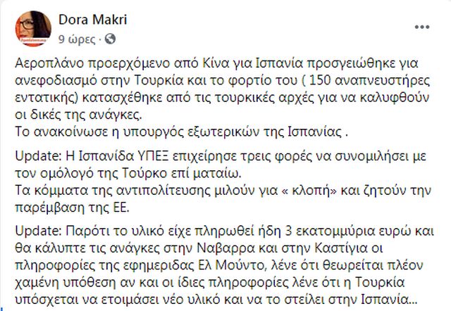 Αεροπλάνο προερχόμενο από Κίνα για Ισπανία προσγειώθηκε για ανεφοδιασμό στην Τουρκία και το φορτίο του (150 αναπνευστήρες εντατικής) κατασχέθηκε από τις τουρκικές Αρχές για να καλυφθούν οι δικές της ανάγκες, γράφει σε ανάρτησή της στο Facebook η δημοσιογράφος Δώρα Μακρή, ανταποκρίτρια της ΕΡΤ στη Μαδρίτη.