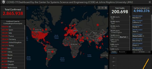 Ξεπέρασαν τους 200.000 οι θάνατοι παγκοσμίως από τον φονικό Covid-19, ενώ το σύνολο των κρουσμάτων του νέου κορωνοϊού αγγίζει τα 3 εκατομμύρια, σύμφωνα με την καταμέτρηση του Πανεπιστημίου Johns Hopkins,