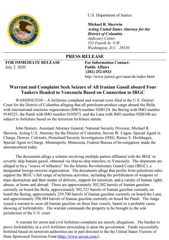 Η κυβέρνηση των ΗΠΑ είναι αποφασισμένη να κατασχέσει τα τέσσερα δεξαμενόπλοια με το ιρανικό πετρέλαιο, διότι θεωρεί πως η όλη επιχείριση «συνδέεται με το Σώμα των Φρουρών της Ισλαμικής Επανάστασης του Ιράν», δηλαδή των πραιτοριανών του θεοκρατικού καθεστώτος της Τεχεράνης, που χαρακτηρίζεται από την Ουάσιγκτον «ξένη τρομοκρατική οργάνωση».