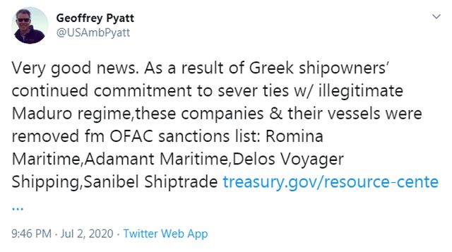 «Πολύ καλά νέα. Ως αποτέλεσμα της συνεχιζόμενης δέσμευσης των Ελλήνων εφοπλιστών να διακόψουν τους δεσμούς με το παράνομο καθεστώς Μαδούρο, αυτές οι εταιρείες και τα σκάφη τους καταργήθηκαν από τη λίστα κυρώσεων OFAC: Romina Maritime, Adamant Maritime, Delos Voyager Shipping, Sanibel Shiptrade», έγραψε ο κορυφαίος Αμερικανός διπλωμάτης στη χώρα μας και παρέθεσε και το λινκ του αμερικανικού υπουργείου Οικονομικών [ΕΔΩ].