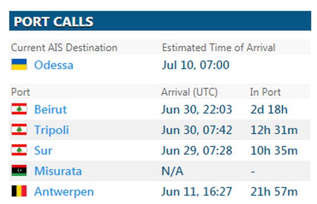 »Στις 10 Ιουνίου απέπλευσε για το Λιμάνι της Αμβέρσας και από εκεί κατευθύνθηκε στη Μισράτα της Λιβύης.