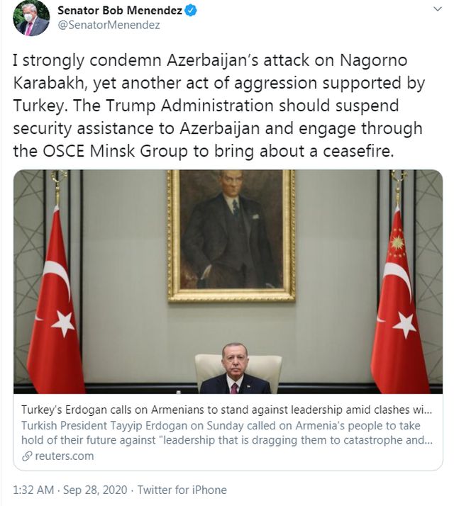 Την επίθεση των Τούρκων Αζέρων στην αρμενική Δημοκρατία του Αρτσάχ (Ναγκόρνο Καραμπάχ) καταδίκασε ο δημοκρατικός Αμερικανός γερουσιαστής Ρόμπερτ Μενέντεζ με ανάρτησή του στο Twitter: