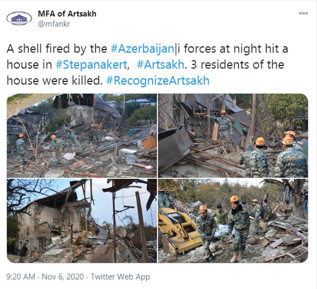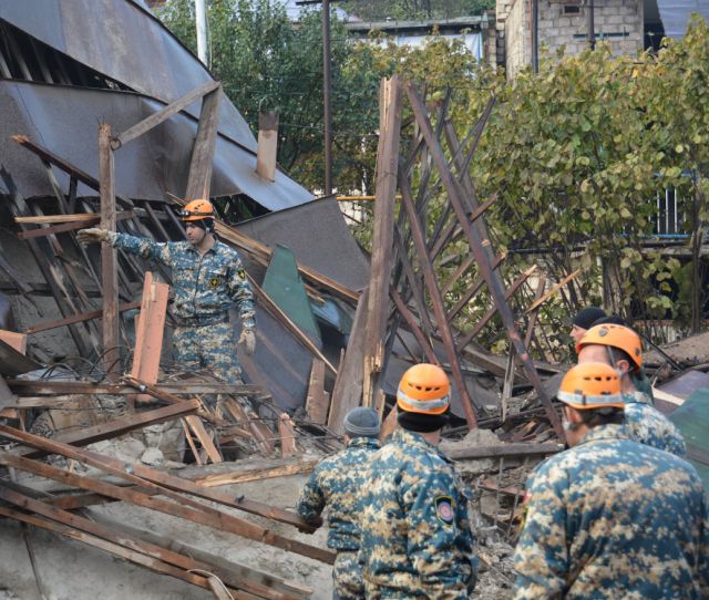 Φωτογραφίες που αναρτήθηκαν από το ΥΠΕΞ του Αρτσάχ, δείχνουν μία βομβαρδισμένη οικία από την οποία ανασύρθηκαν τρεις άμαχοι νεκροί.