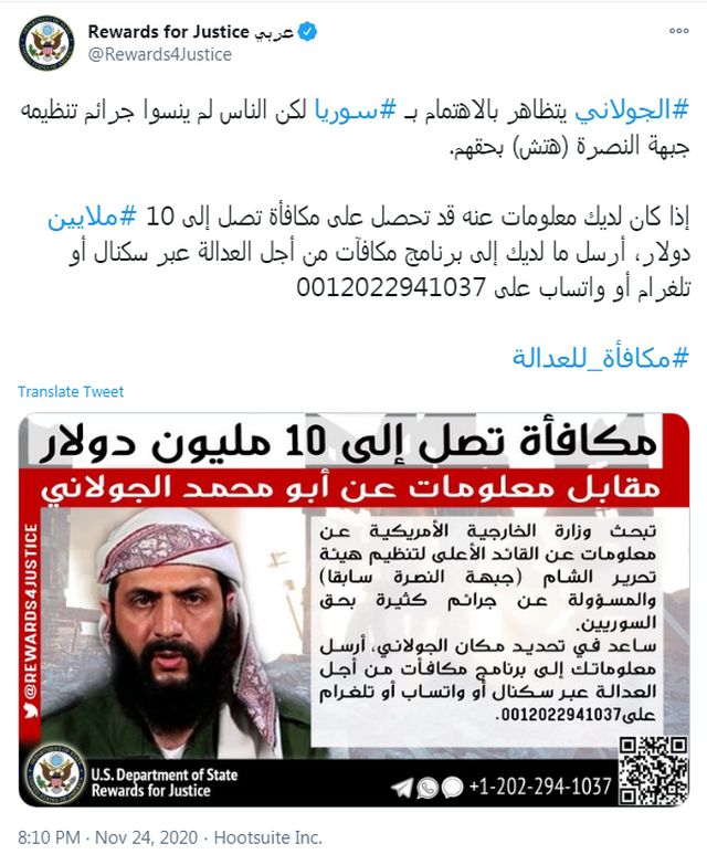 Οι Ηνωμένες Πολιτείες προσφέρουν έως 10 εκατ. δολάρια αμοιβή για πληροφορίες που θα οδηγήσουν στη σύλληψη του ηγέτη της συριακής Αλ Κάιντα, Άμπου Μοχάμεντ Αλ Γκολάνι.