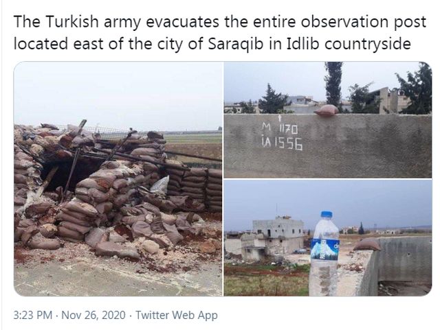 Τις τελευταίες 72 ώρες οι τουρκικές ένοπλες δυνάμεις έχουν αρχίσει να αποσύρουν τα στρατεύματά τους από ένα ακόμα φυλάκιο-οχυρό τους στη βορειοδυτική Συρία, μεταδίδει το Al Masdar News.