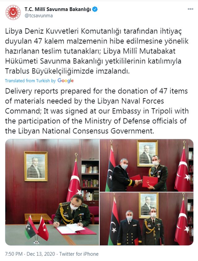 Η Τουρκία θα δωρίσει στρατιωτικό εξοπλισμό στη Ναυτικό της ισλαμιστικής Κυβέρνησης Εθνικής Συμφωνίας της Τρίπολης, στη Λιβύη, αναφέρει τουρκικό δημοσίευμα.