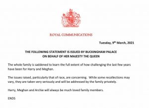 Σχετικά με το σχόλιο για το χρώμα του μωρού του Δούκα και της Δούκισσας του Σάσεξ, η βασίλισσα στην ανακοίνωση που έδωσαν στη δημοσιότητα τα Ανάκτορα, αναφέρει ότι είναι πολύ ανησυχητικό και το θέμα θα το χειριστεί ιδιαιτέρως η οικογένεια.