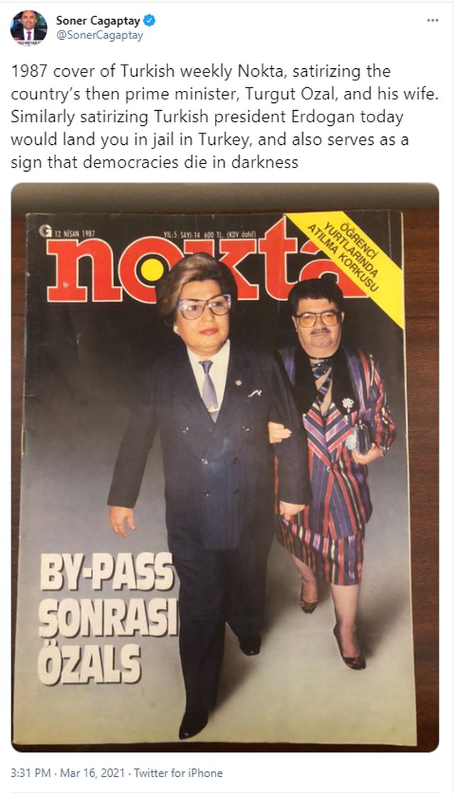 Ο τουρκικής καταγωγής δημοσιογράφος, Σονέρ Τζαγαπτάι (Soner Cagaptay), που ζει στην Αμερική, ανάρτησε στο twitter ένα σατιρικό εξώφυλλο περιοδικού, από το 1987, με στόχο τον τότε Τούρκο πρόεδρο Τουργκούτ Οζάλ και τη σύζυγό του.